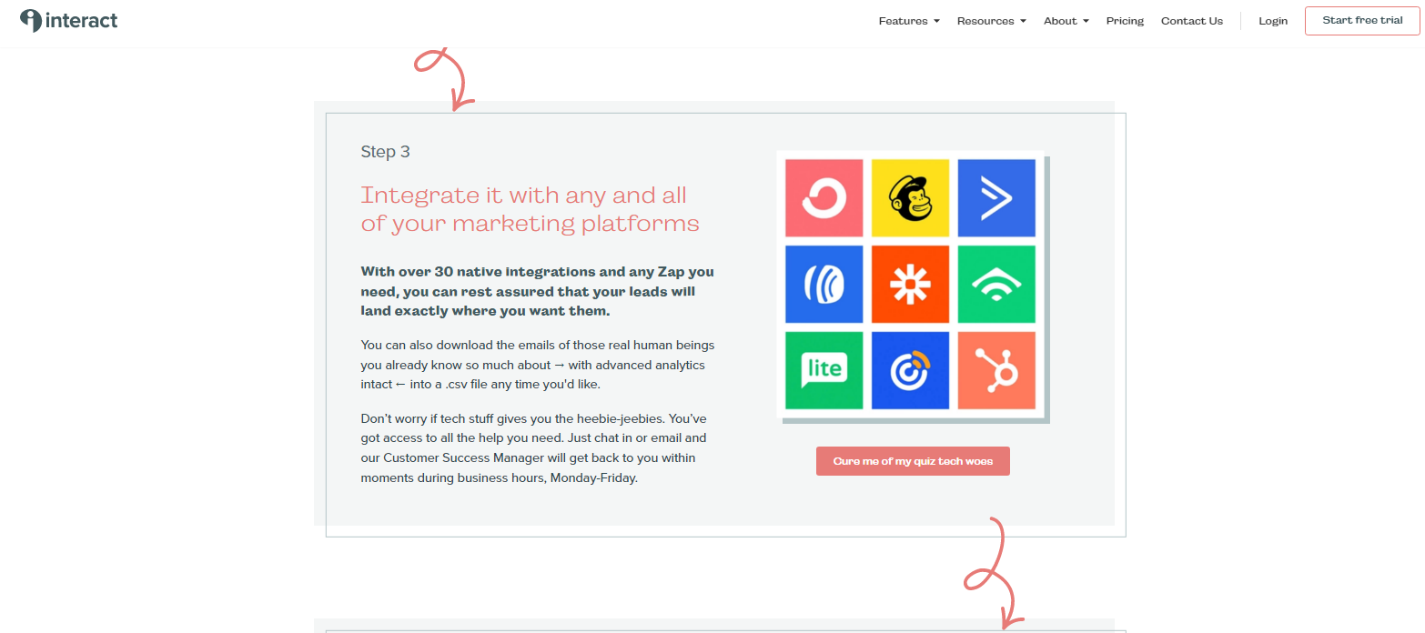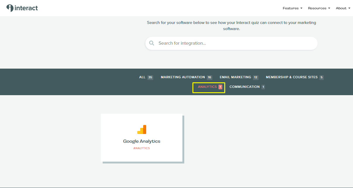 With the integration part, you can connect it to email marketing or a marketing automation system. So quiz leads get automatically added to your existing system. In the search box, you can search for the software to see how your Interact quiz can connect to your marketing software. There are various integration categories for tools available.